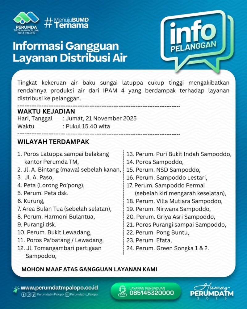 PERUMDA TM Palopo — Tingkat kekeruan air baku sungai latuppa cukup tinggi mengakibatkan rendahnya produksi air dari IPAM 4 yang berdampak terhadap layanan distribusi ke pelanggan.