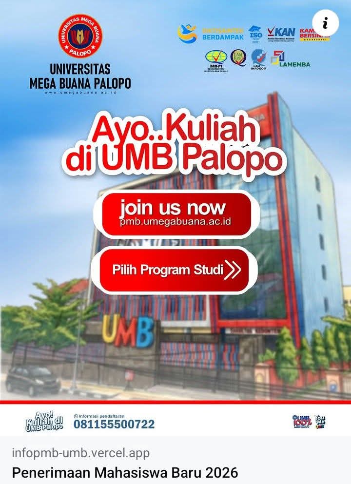 PALOPO – Investasi terbaik untuk masa depan adalah pendidikan yang berkualitas. Menjawab tantangan dunia kerja yang semakin kompetitif, Universitas Mega Buana (UMB) Palopo kembali membuka kesempatan bagi putra-putri terbaik bangsa untuk bergabung melalui Pembukaan Penerimaan Mahasiswa Baru (PMB) Tahun Akademik ini.