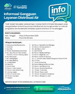 Telah terjadi kerusakan pada jaringan instalasi listrik di Intake Batupapan yang mengakibatkan terhentinya pompa distribusi air dari sungai sumber air baku ke pengolahan dan berdampak terhadap layanan distribusi air ke pelanggan.