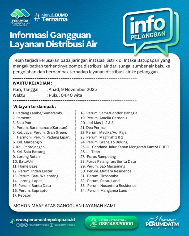 Wilayah terdampak: 1. Padang Lambe/Sumarambu. 2. Pamenta. 3. Salu Pao. 4. Perum. Baramamase (Karetan). 5. Kel. Jaya (Perum. Gran Green, Harmoni, Perum. Padang Lipan). 6. Kel. Maroangin. 7. Kel. Pentojangan. 8. Kel. Salu Battang. 9. Lorong Rotan. 10. Batu/Uri. 11. Home Base. 12. Perum. Indah Lestari. 13. Perum. Batu Walenrang. 14. Lorong. Lapas. 15. Perum. Buntu Datu. 16. Perum. Suprapto. 17. Pepabri. 18. Perum. Sama/Pondok Bahagia. 19. Perum. Amelia Garden 1. 20. Jati Mas 1, 2 & 3. 21. Dea Permai. 22. Perum. Medika/Adi Raja. 23. Perum. Magfirah1& 2. 24. Perum. Graha To Bulung. 25. JL. Cendana Jalur Kanan Mengarah Kantor PUPR. 26. Jl. Titan. 27. Poros Rampoang. 28. Poros Palangiran/Buntu Datu. 29. Perum. Sao Macanning. 30. Perum. Mutiara Residence. 31. Perum. Tirosomba. 32. Perum. Pasau Land. 33. Perum. Nusantara Residence. 34. Perum. Manganna Land.