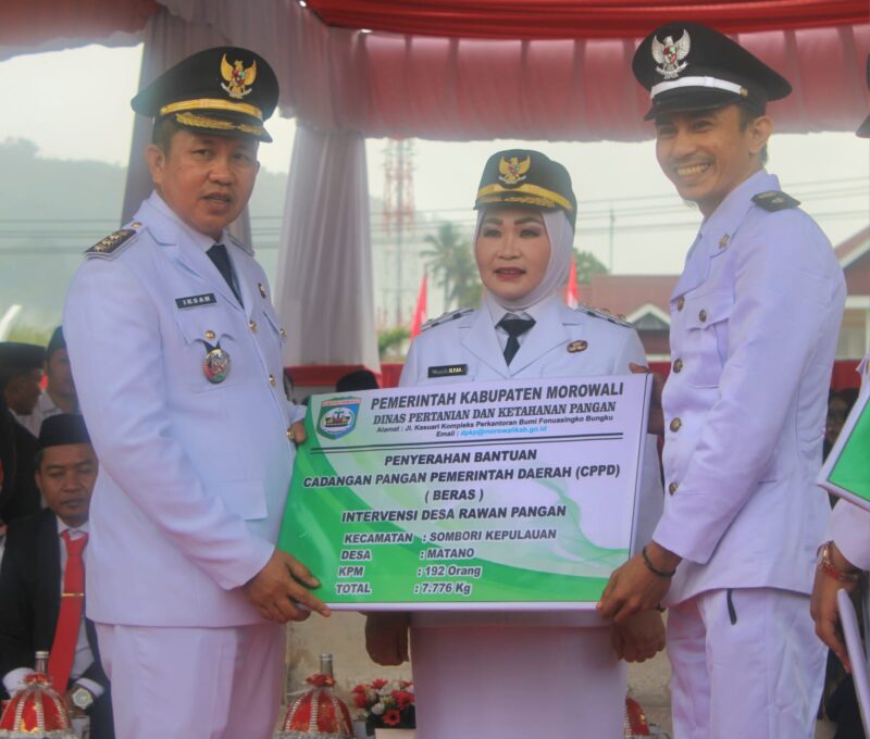 Bantuan cadangan pangan tersebut diserahkan langsung oleh Bupati Morowali, Iksan Baharudin Abdul Rauf, bersama Wakil bupati (Wabup), Iriane Iliyas, usai pelaksanaan upacara pengibaran Bendera Merah Putih, di Alun-alun Rujab Bupati Morowali.
